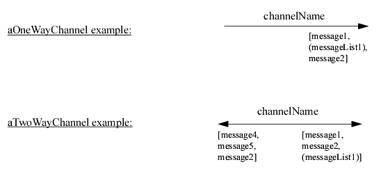 Channels have names and are represented by a one-way or two-ways arrows. A channel name is written next to the arrow without any specific delimiter. The list of messages going in a specific way are listed next to the arrow between brackets and separated by commas. Messages can be gathered in message lists, to indicate a message list in the list of messages going through a channel the message list is surrounded by parenthesis. Note the same message can be listed in both directions.